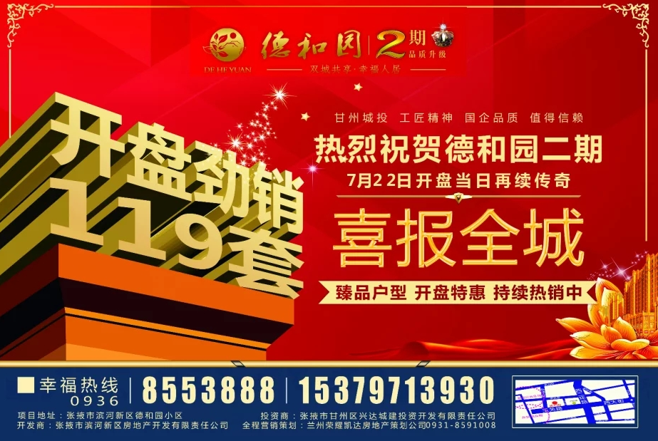 2016年7月22日上午9时许,张掖德和园二期住宅项目盛大开盘。当天现场火爆非凡,创下开盘当日成交119套的张掖楼市销售辉煌,成为全城焦点。其过硬的建筑品质、优越的地理位置以及国企开发商的品牌实力,获得了广大消费者的一致好评。