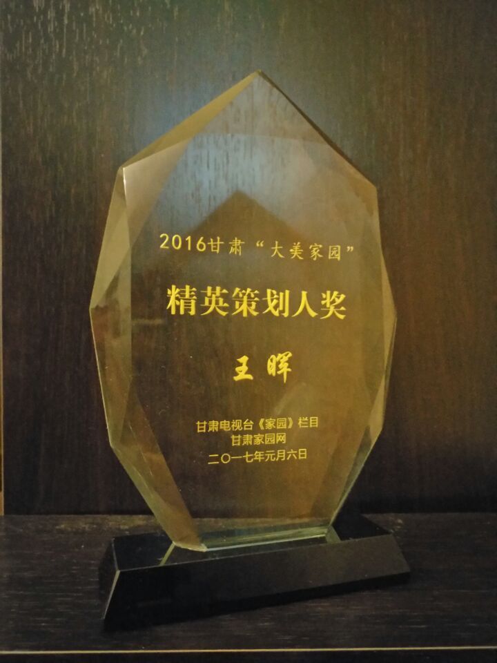当天下午5时许,在兰州锦江阳光酒店阳光厅,“大美家园”颁奖盛典正式开始。兰州荣耀凯达房地产策划有限公司总经理王晖,荣获2016年度甘肃“大美家园”精英策划人奖。