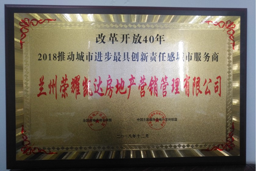 2018年12月26日至30日,在银川、广州举办的《改革开放40年·推动中国城市进步的力量大型使命鉴证行动暨2018中国地产荣誉》颁奖仪式、南北地产峰会上,兰州荣耀凯达房地产营销管理有限公司荣获“2018推动城市进步最具创新责任感城市服务商”殊荣!