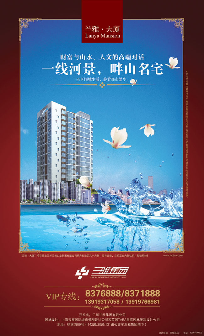 兰雅•亲河湾地处兰州市城关区北滨河路徐家湾片区,背靠九州台山国家森林公园,南临黄河,地块整体北高南低,落差近15米左右,分三个阶梯,视野极为开阔,是兰州市为数不多的背山面水自然景观优越的地块,项目南侧紧邻政府规划的徐家湾城市辅道。项目坐落于“四十公里黄河风情线”核心区域,西侧一公里处为七里河黄河大桥,东侧一公里处为小西湖黄河大桥。该项目是兰雅集团斥巨资倾力打造的兰州一处拥有私家山的高尚畔山水岸住宅。项目总占地面积3.2万平方米,总建筑面积11.98万平方米,由7栋12层—18层的小高层、高层建筑组成,共751户;绿地面积1.8万平方米,绿化率达到56%;商铺5200平方米,506个停车位。