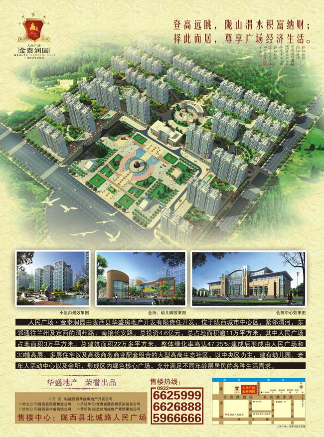 陇西县人民广场•金泰润园是由陇西华盛房地产开发有限责任公司开发的,项目位于陇西县开发新区,紧邻渭河,东邻通往兰州及定西的和蒲路,南接长安路。小区建成后形成由人民广场和33幢高层、多层住宅以及高级商务商业配套组合的大型高尚生态社区。项目总占地面积逾11万平方米,其中人民广场占地面积3万平方米。总建筑面积18万多平方米。整体绿化率高达31.25%,容积率为2.04。项目总投资4.6亿元,分三期建成。一期预计投入1.8亿元,拟建成人民广场以及三幢高层商住楼。